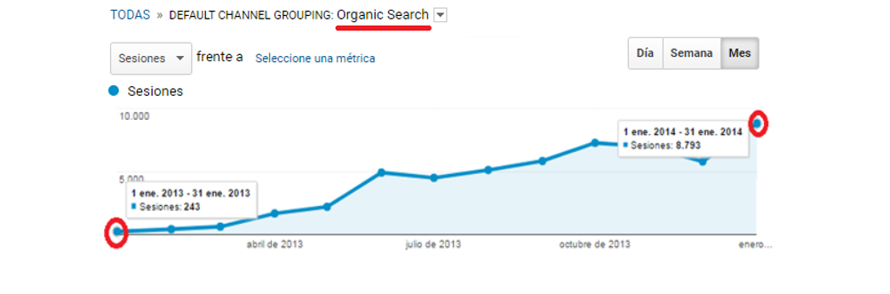 Resultados SEO de un cliente a lo largo de 1 año (Ene 2013 - Ene 2014): de 243 visitas al mes a 8.793 visitas al mes (tráfico orgánico “no pagado” de buscadores). Fuente: Google Analytics