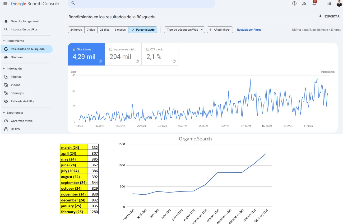 Resultados SEO de un cliente a lo largo de 11 meses (Mar 2024 - Feb 2025): de 332 visitas al mes a 1.280 visitas al mes (tráfico orgánico “no pagado” de Google). Fuente Google Search Console
